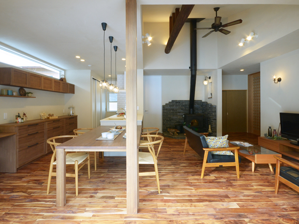 床は無垢のハックルベリー、吹抜けから薪ストーブの煙突による